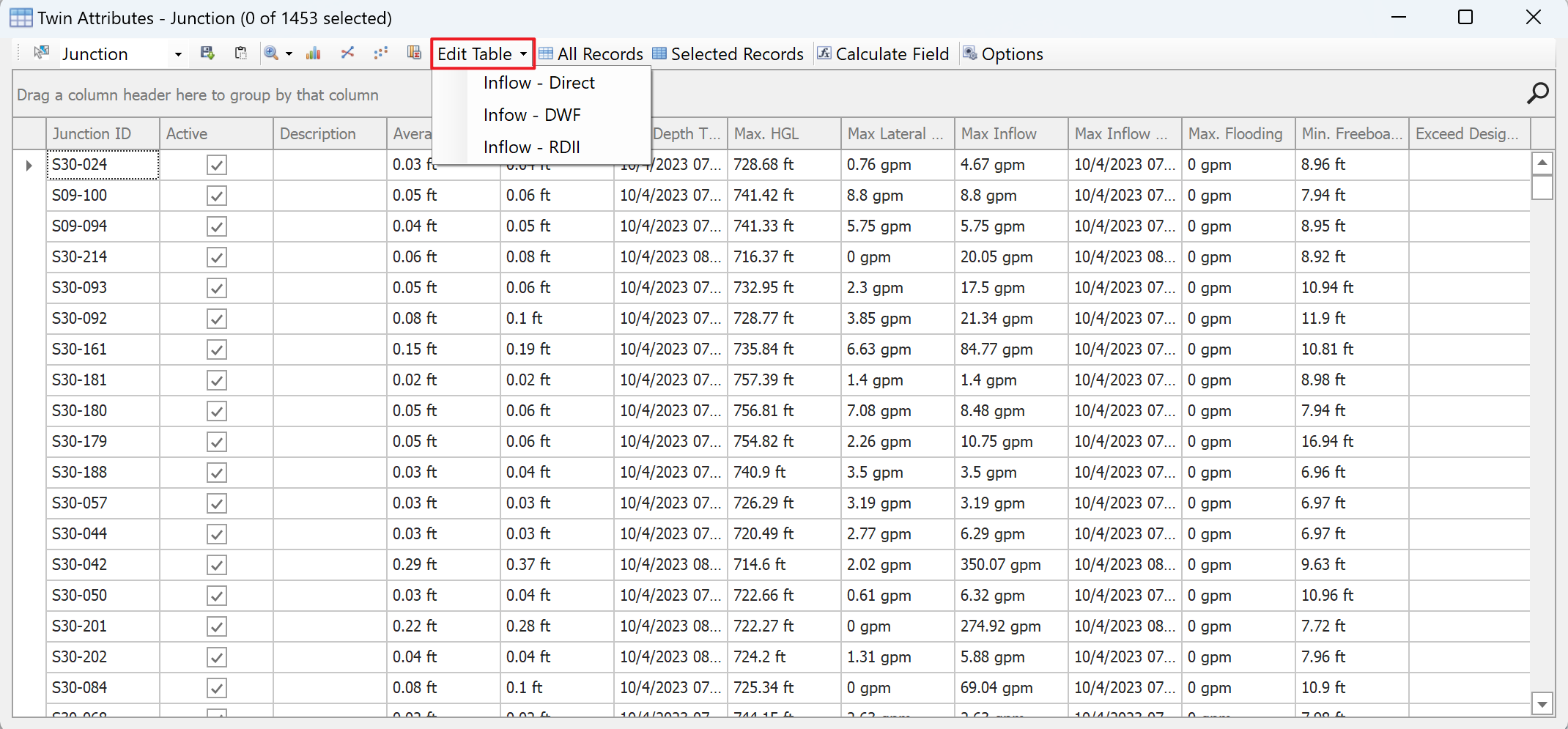 Inflows in all or a selection set of junction in the network can be assigned through the inflow tables. These inflow tables can be accessed through the Junction Twin Attribute Table > Edit Table dropdown menu.