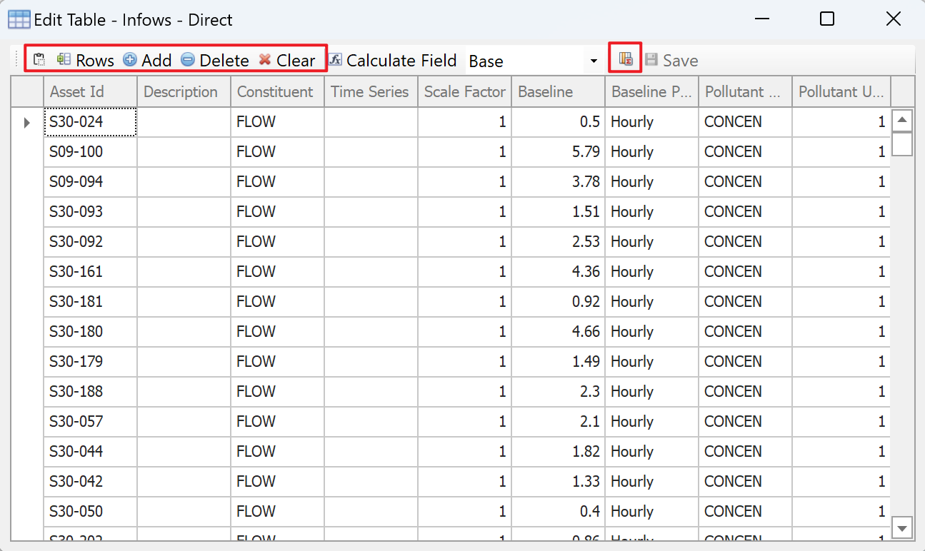 Clicking on any of the table option (i.e. Inflow - Direct, Inflow - DWF, Inflow - RDII) open a new table containing the inflows of all the junctions (or the junctions that are currently selected in the map). These tables are pastable. As a result, the user can add the number of rows required and paste the inflow data from a spread sheet. Moreover, multiple rows of inflows for the same asset is allowed, which will be aggregated and added to that junction node. The AquaTwin Sewer convention for the Direct and Dry Weather inflows is,