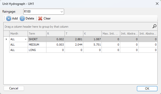 Unit Hydrographs (UHs) estimate rainfall-dependent infiltration and inflow (RDII) into a sewer system. A UH set contains up to three such hydrographs, one for a short-term response, one for an intermediate-term response, and one for a long-term response. A UH group can have up to 12 UH sets, one for each month of the year. Each UH group is considered as a separate object by AquaTwin Sewer, and is assigned its own unique name along with the name of the rain gage that supplies rainfall data to it.