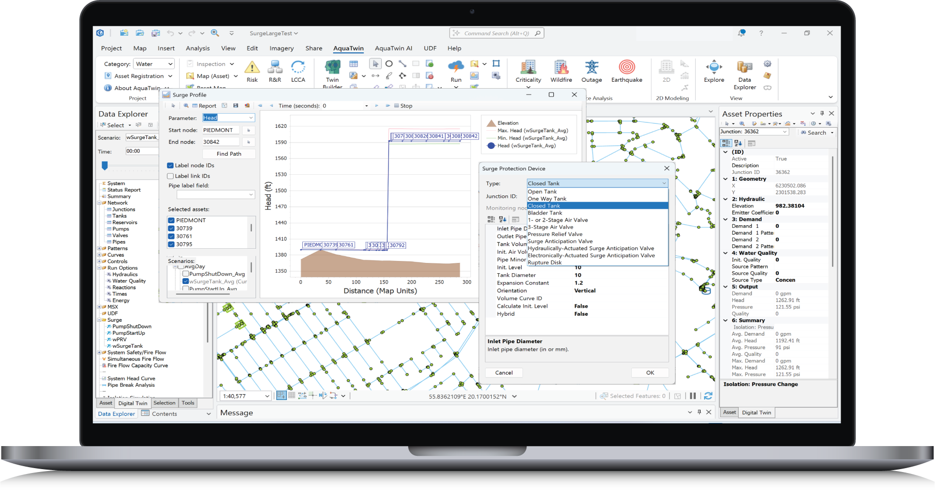 Built right into ArcGIS Pro®, AquaTwin Surge is the next-generation transient flow simulation software for safe, reliable, sustainable and resilient water infrastructure. Hydraulic transients can introduce large pressure forces and rapid fluid accelerations into a water distribution system. These disturbances can result in pump and equipment damage, system fatigue, water-column separation, pipe rupture, and even dirty water (pathogen) intrusion. Pump failures, valve operations and operator error can lead to hydraulic transients with damaging effects. The severity of hydraulic transients must thus be determined to properly identify and eliminate weak spots.