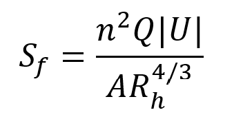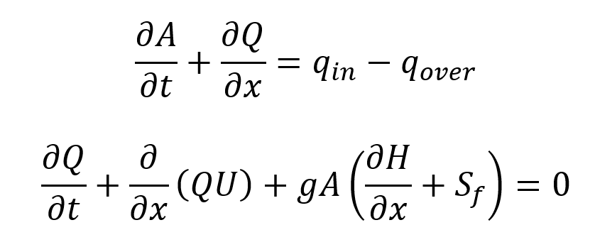 where A is the cross-sectional area of flow, Q is the flowrate, U is the average velocity of the flow, H is the hydraulic head, x is distance, t is time, qin is the lateral inflow per unit width, qover is the overflow per unit width, and Sf is the friction slope can be expressed in terms of Manning equation as: