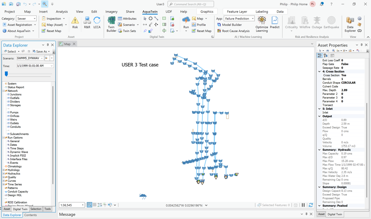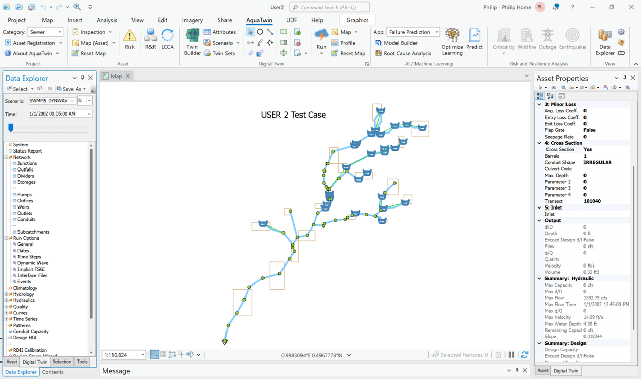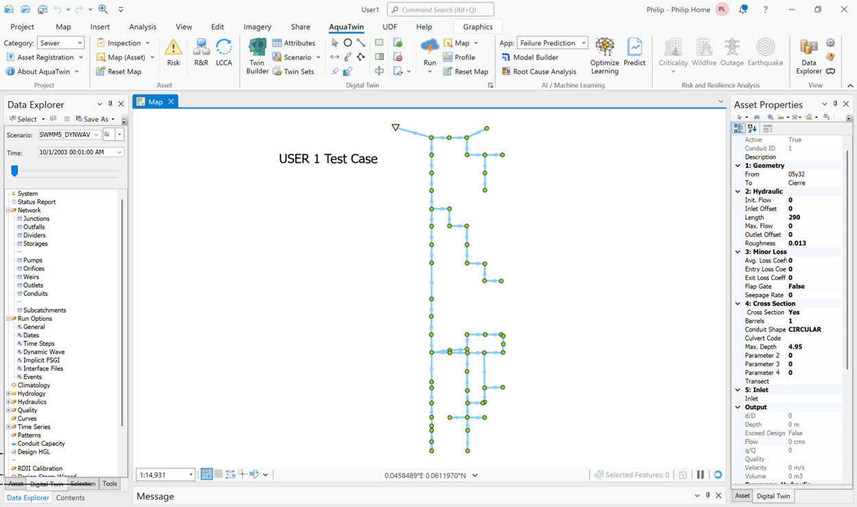 USER 1 network is shown in Figure 13 and consists of a 175-hectare drainage area divided into 58 subcatchments. The conveyance system contains 59 circular conduits connected to 59 junctions and a single outfall. The elevation profile of the main interceptor drops almost 19 m over 2.5 km. The hydraulic simulation was carried out using 5 second and 60 second flow routing time steps for a 7-hour duration with a 1-minute reporting time step.