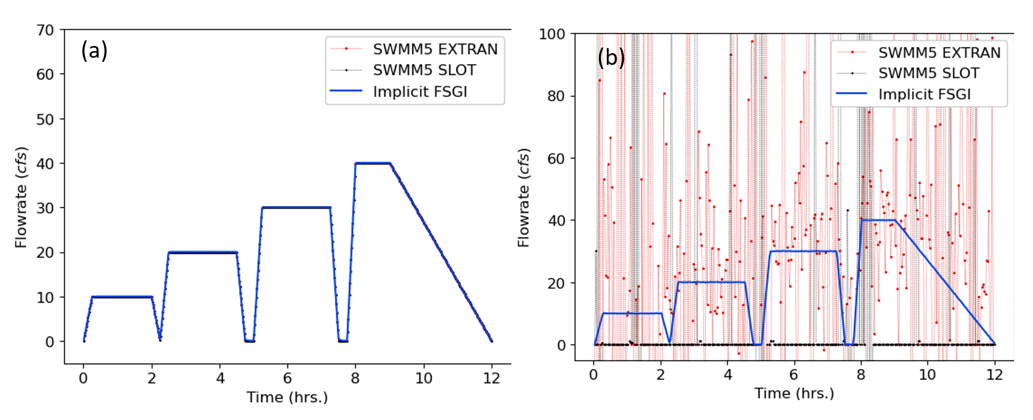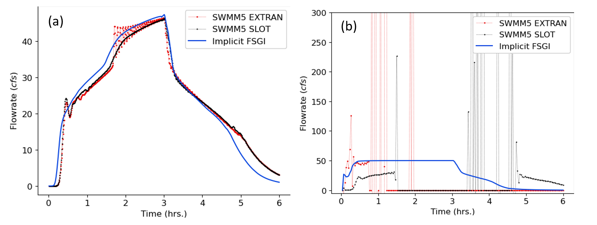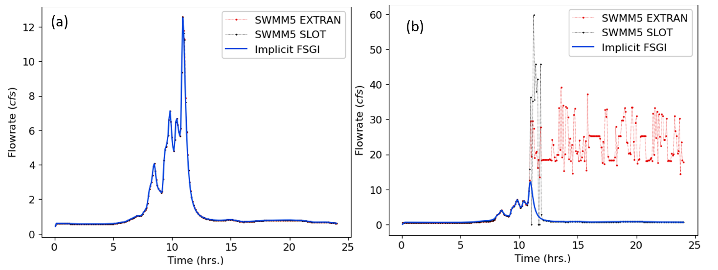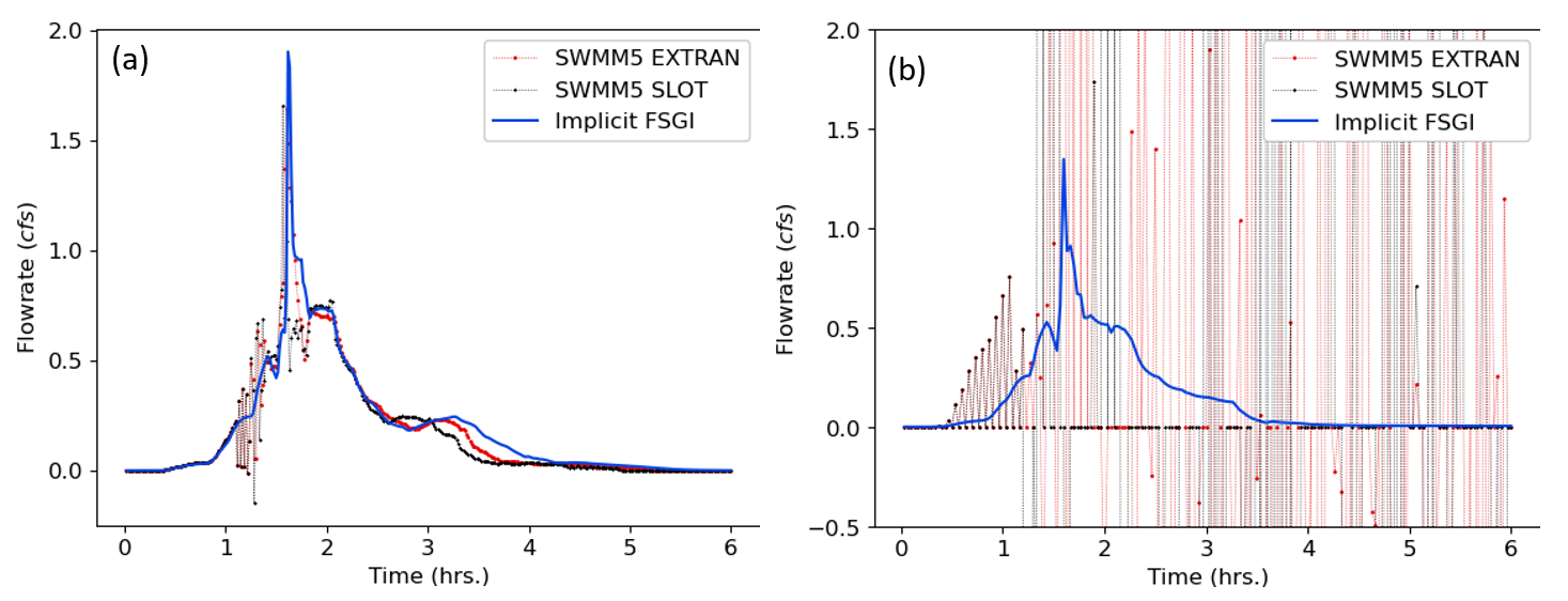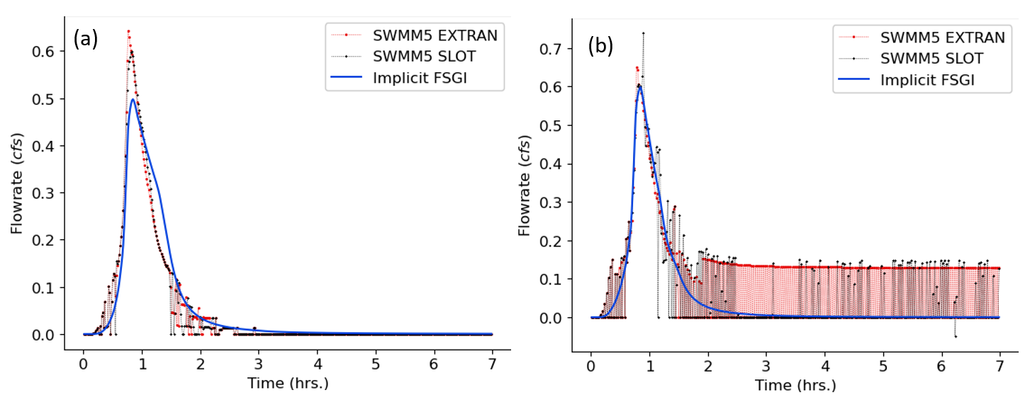 Figure 2: TEST 1 flowrate comparisons for link 9 between SWMM5 EXTRAN, SWMM5 SLOT and Implicit FSGI for a routing timestep of (a) 5 seconds and (b) 120 seconds.