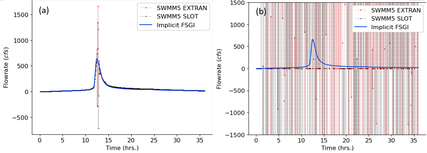 Both SWMM5 EXTRAN and SLOT show signs of instability in some of the links at a 5-second routing time step as depicted in Figure 16(a) while implicit FSGI is completely stable. At a 30 second routing time step, both SWMM5 EXTRAN and SWMM5 SLOT are completely unstable resulting in mass balance errors of -392380.397% and -121031.309%, respectively. The implicit FSGI is completely stable at a 30 second routing time step and the mass balance error is 2.225%.