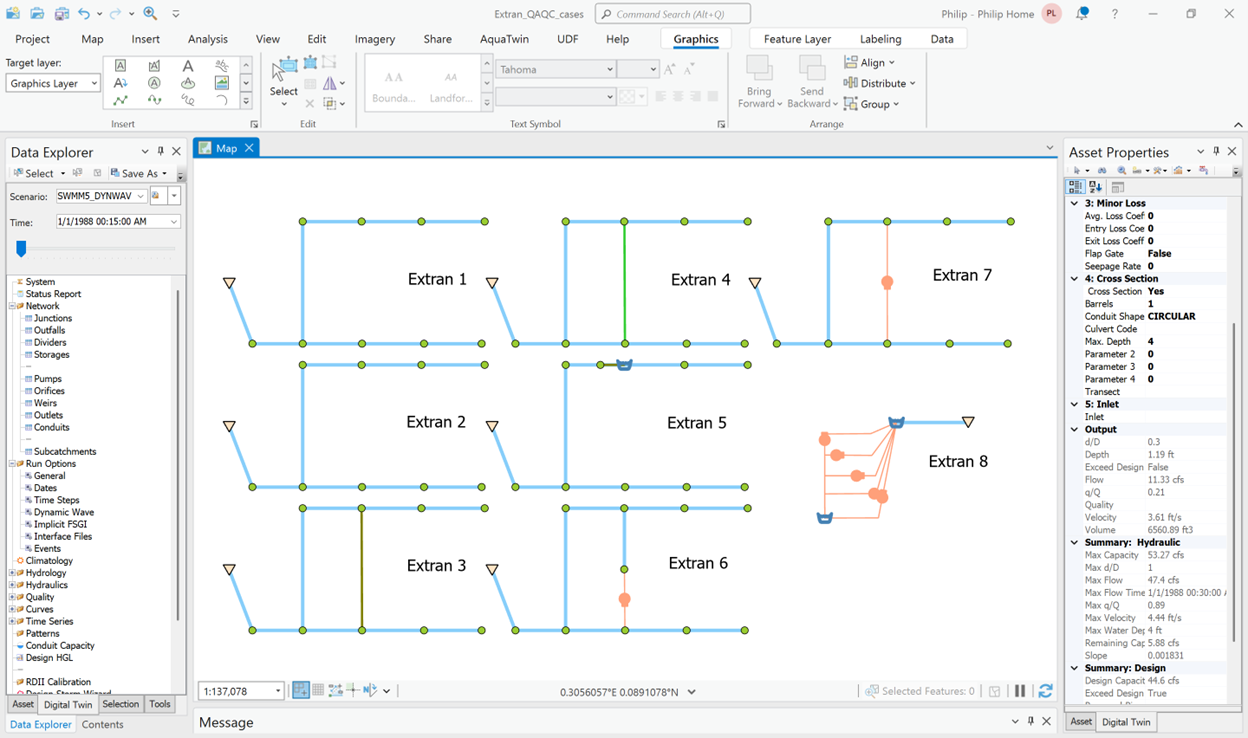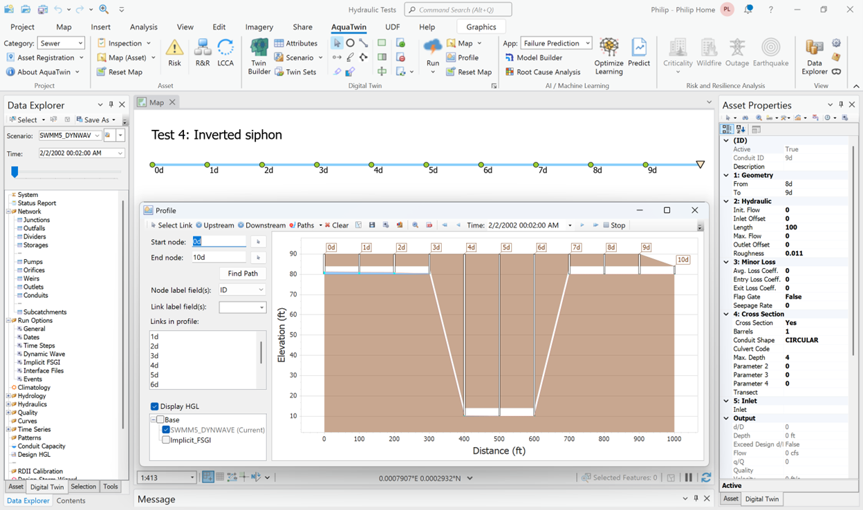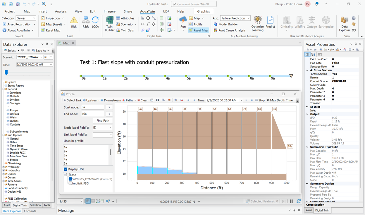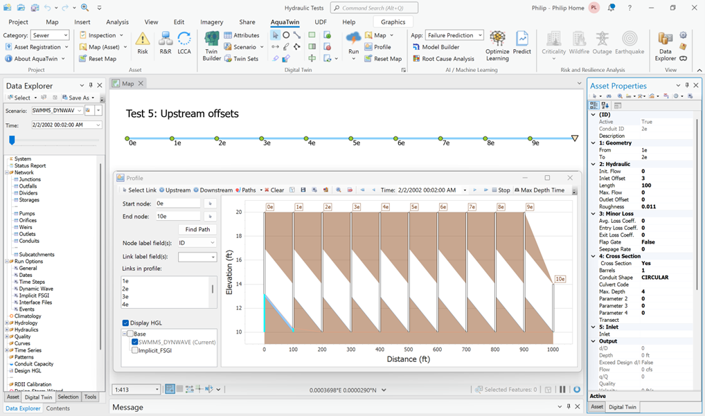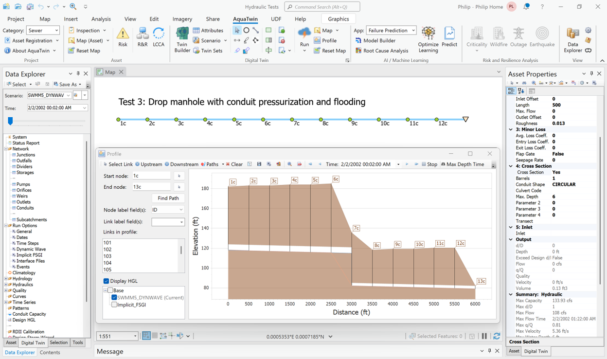 Justification for the use of any numerical scheme rests on its efficiency and stability to solve problems by means of computer implementation. Overall, this is a comprehensive task, involving extensive analysis and investigation. More specifically, both the SWMM5 Dynamic Wave and the implicit FSGI are coded in AquaTwin Sewer and can be tested under identical input data and equal accuracy tolerances.