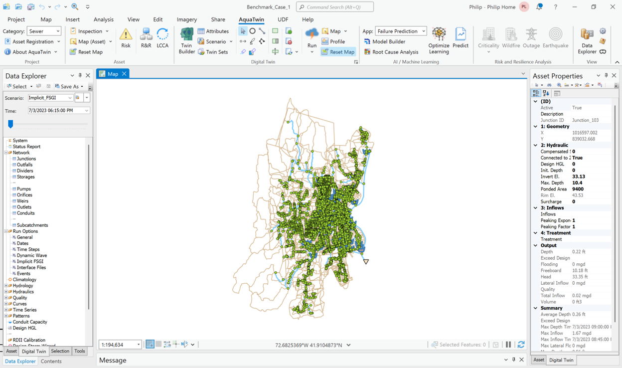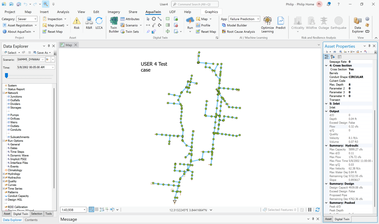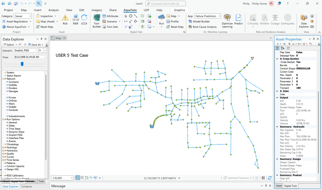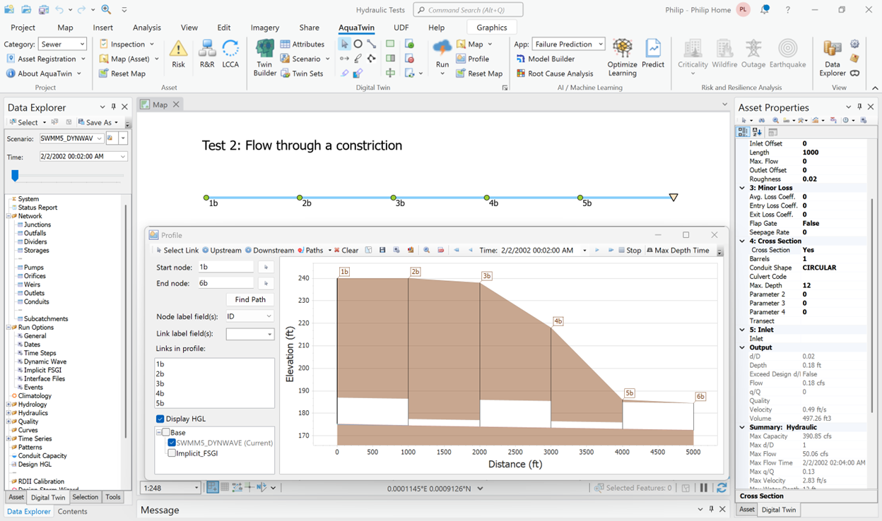 Justification for the use of any numerical scheme rests on its efficiency and stability to solve problems by means of computer implementation. Overall, this is a comprehensive task, involving extensive analysis and investigation. More specifically, both the SWMM5 Dynamic Wave and the implicit FSGI are coded in AquaTwin Sewer and can be tested under identical input data and equal accuracy tolerances.