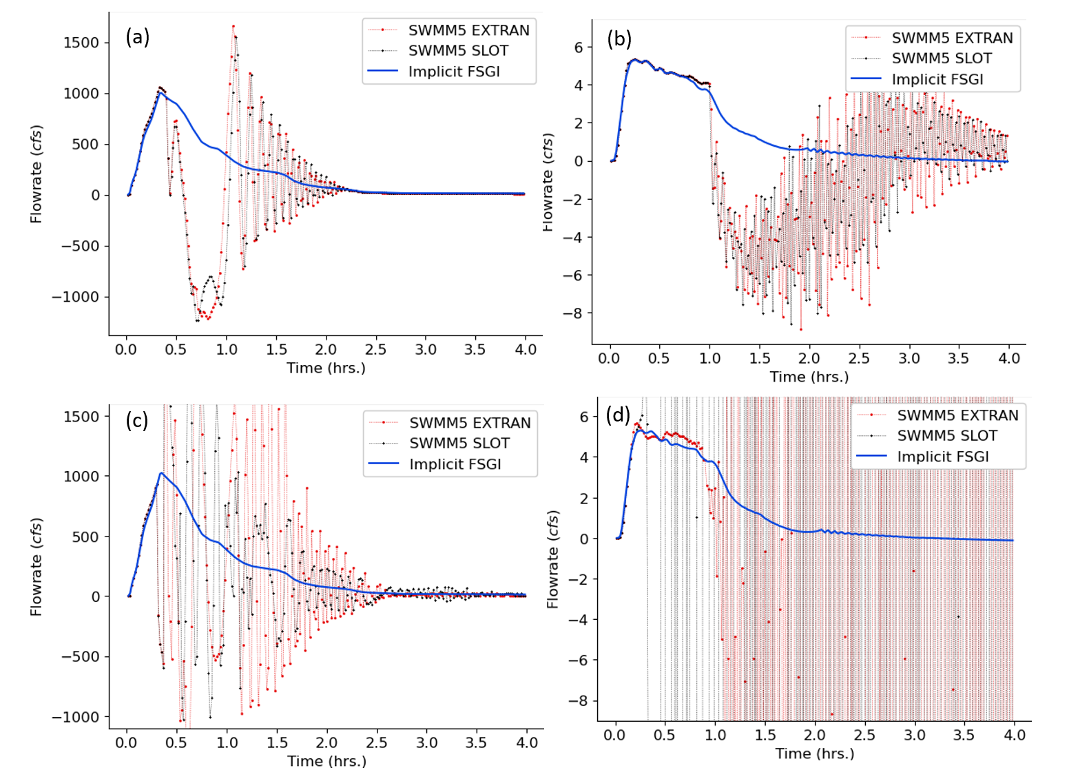 Figure 22: USER 5 flowrate comparisons for (a) link LIB_1 for a routing timestep of 0.5 second, (b) link 626 for a routing timestep of 0.5 second, (c) link LIB_1 for a routing timestep of 3 second, and (d) link 626 for a routing timestep of 3 second between SWMM5 EXTRAN, SWMM5 SLOT and implicit FSGI for a routing timestep of (a) 0.5 seconds and (b) 3 seconds.