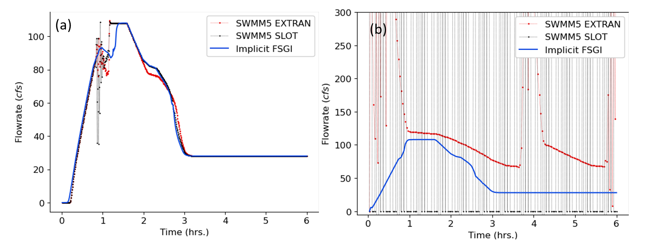 Figure 6: TEST 3 flowrate comparisons for link 105 between SWMM5 EXTRAN, SWMM5 SLOT and implicit FSGI for a routing timestep of (a) 5 seconds and (b) 120 seconds.