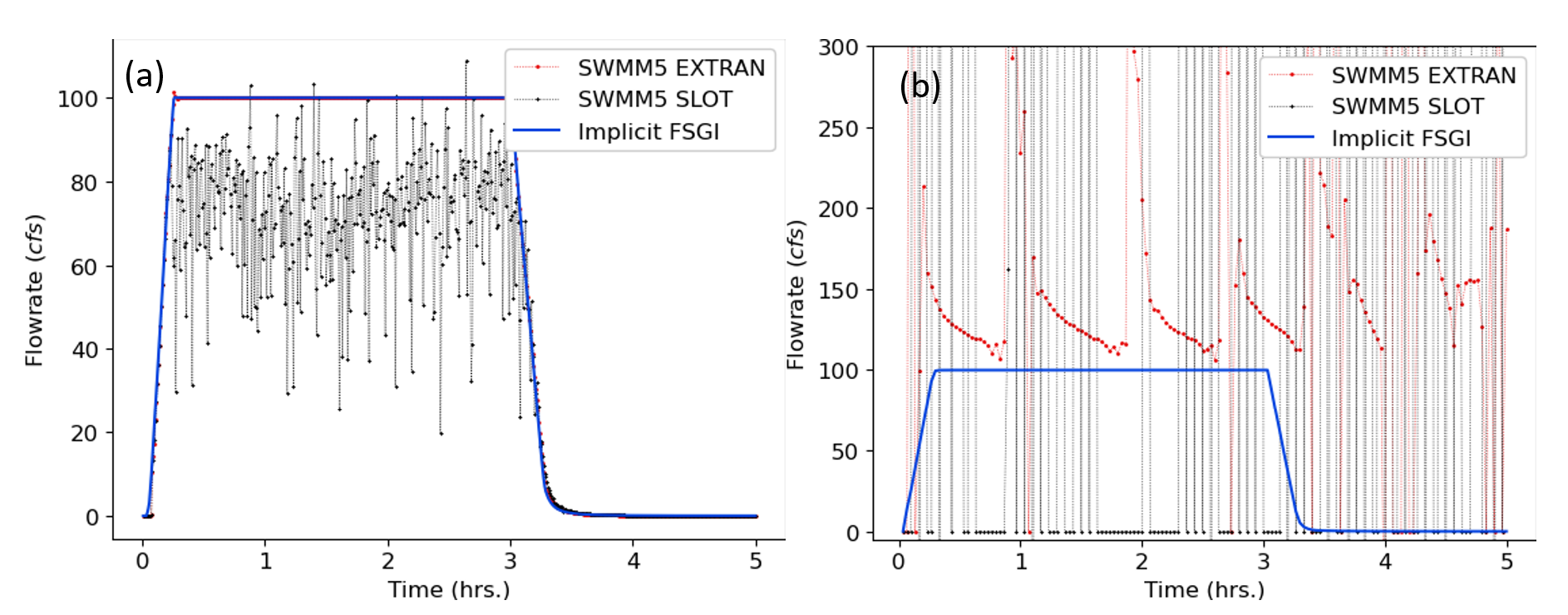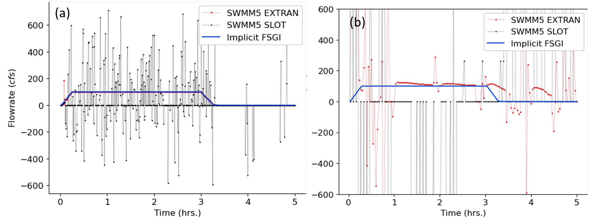 Figure 8: TEST 4 flowrate comparisons for link 5 between SWMM5 EXTRAN, SWMM5 SLOT and implicit FSGI for a routing timestep of (a) 5 seconds and (b) 120 seconds.