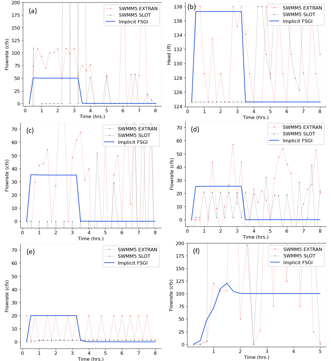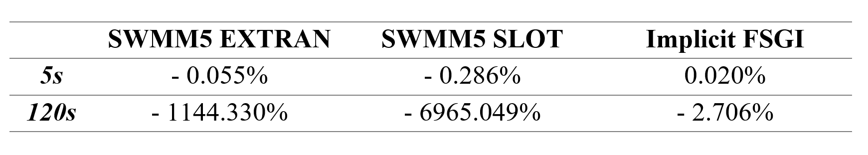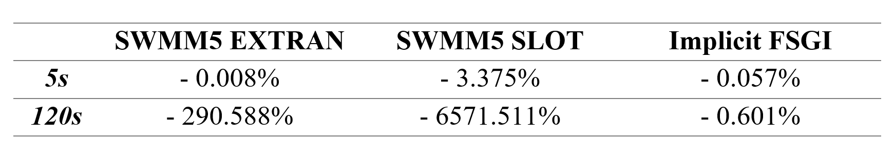 Figure 8 depicts the flowrate in link 5 for SWMM5 EXTRAN, SWMM5 SLOT and implicit FSGI for 5 second and 120 second routing time steps. For a 5 second routing time step, both SWMM5 SLOT and implicit FSGI are stable. However, SWMM5 SLOT is completely unstable. For a 120 second routing time step, both SWMM5 EXTRAN and SLOT are unstable whereas implicit FSGI is stable and conserves mass. The mass balance errors for both scenarios are shown in Table 4.