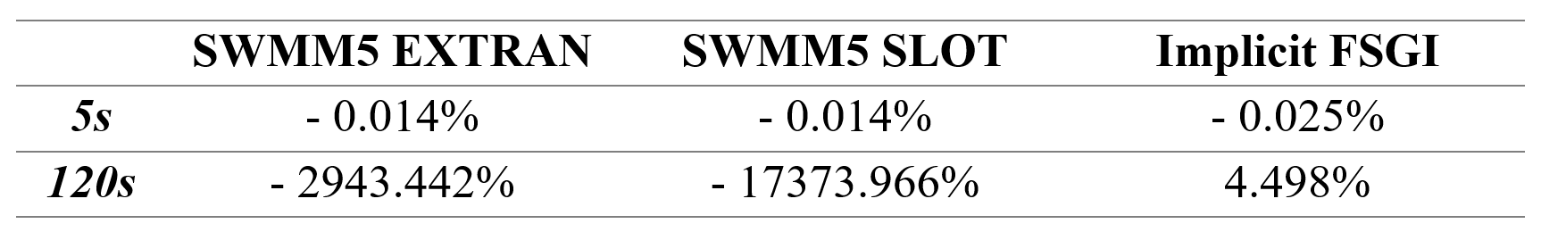 Figure 10 depicts the flowrate in link 1 for SWMM5 EXTRAN, SWMM5 SLOT and Implicit FSGI for 5 second and 120 second routing time steps. For the 5 second routing time step, SWMM5 EXTRAN, SLOT and implicit FSGI are stable. However, both SWMM5 EXTRAN and SLOT are unstable for a 120 second routing time step, whereas the implicit FSGI is stable and conserves mass. The mass balance errors for both scenarios are shown in Table 5.