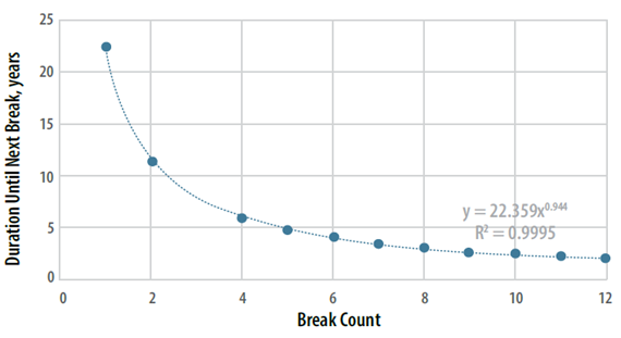 Developing such a model for a system of the District’s size was a massive undertaking, but the quality of the GIS data produced factors with a high degree of confidence. For instance, the LOF factor for break rate was based on the “duration to next break”, or to put it in other words, how long before a main that has broken will break again. When applied to the whole system, this statistic was found to have a greater than 99% R-squared value, which is a measure of how well a model fits to a data set.