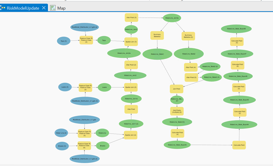 The District’s model was created in model builder to combine several GIS features into a single, comprehensive table that could be leveraged for easy updating of the risk model. This model combined service taps, break rate, and break count and normalizes the data based on the age of the water main. The results are then fed into the AquaTwin Asset model.