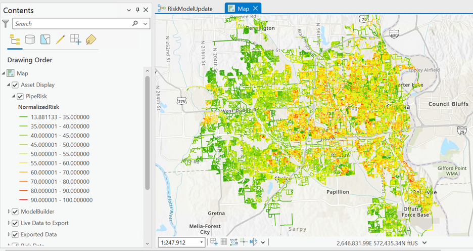 Next, the factors were built and applied to each of the 80,000 pipe segments in a massive spreadsheet. But how do you make this model more dynamic? Enter AquaTwin Asset empowered by Esri ArcGIS Pro.