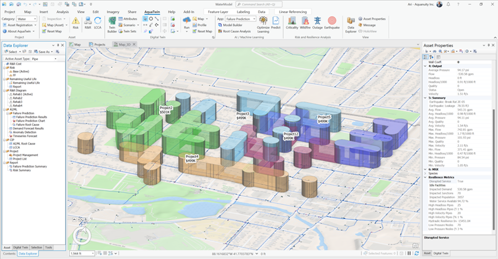 The District currently uses AquaTwin Water for hydraulic modeling which allows them to leverage model output data directly into the risk model. One of the primary reasons why AquaTwin Water was chosen was its complete integration in the ArcGIS Pro environment. The fact that there were no external data tables, that it supported Utility Network out-of-the-box, and that it natively used ArcGIS Pro selection and other tools was important to the District.